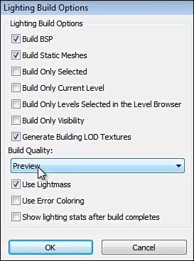 Build Lighting to see more accurate results of your level. I chose Preview to speed up the lighting build.