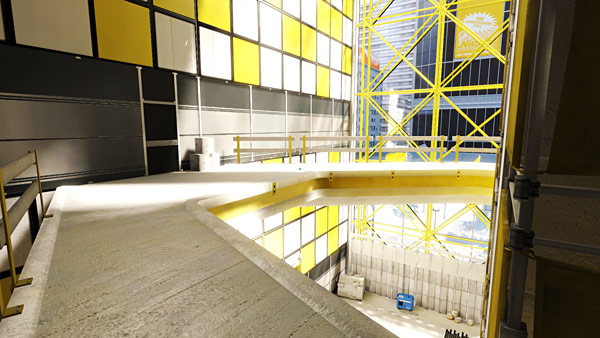 You then reach the rooftop that uses predominantly cool blue color with warm orange where you start and where you need to go:
