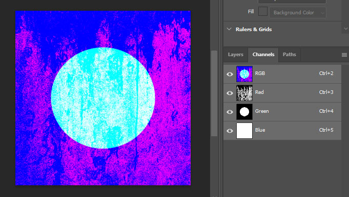 Here is an example from the video where I have 2 Opacity Masks being used, one in Red, one in Green and nothing in Blue: