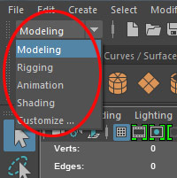 Menu Sets define Maya LT to be used for a specific function. These include Modeling, Animation, Rigging and Shading: