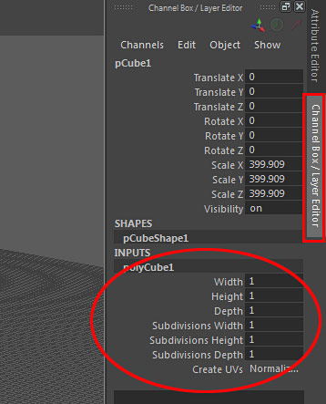 For game environment modeling you will be using both Channel Box and Attribute Editor to set various dimensions for the polygonal objects such as width, height, depth, subdivisions, renaming objects, setting input/output components and editing material/shader properties on objects: