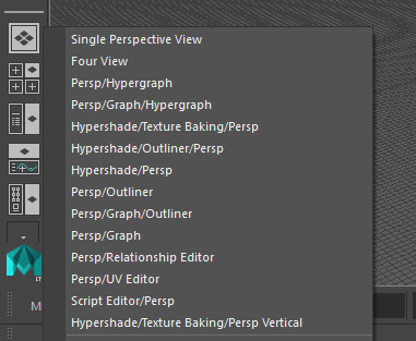 Most commonly used for game environment modeling are Single Perspective, Four View and Outliner/Perspective (first three icons):
