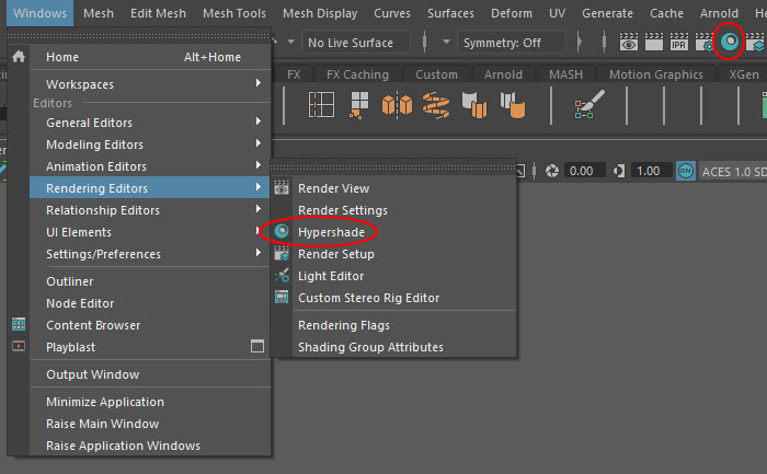 To manage materials, you'll use Hypershade, Maya's material editor by going to Window > Rendering Editors > Hypershade or in the top toolbar: