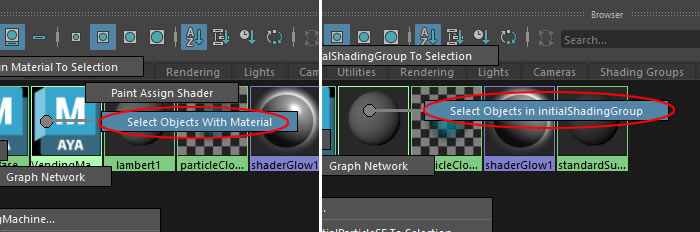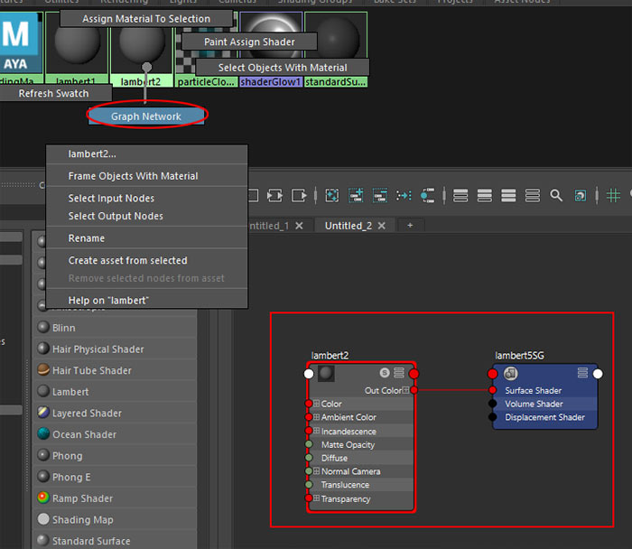 For advanced users: you can view the material's node network: Right-Click on the Material in Hypershade and select Graph Network to see connected nodes. This is useful for when you need to work with the Material and its various nodes to make adjustments.