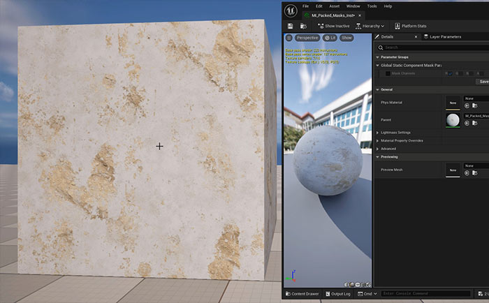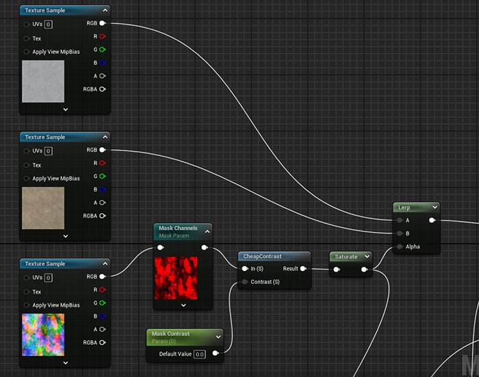 Then brought it the packed mask texture and used a Component Mask (converted to parameter) in order to let me select individual RGB channels through the Material Instance.
