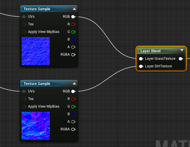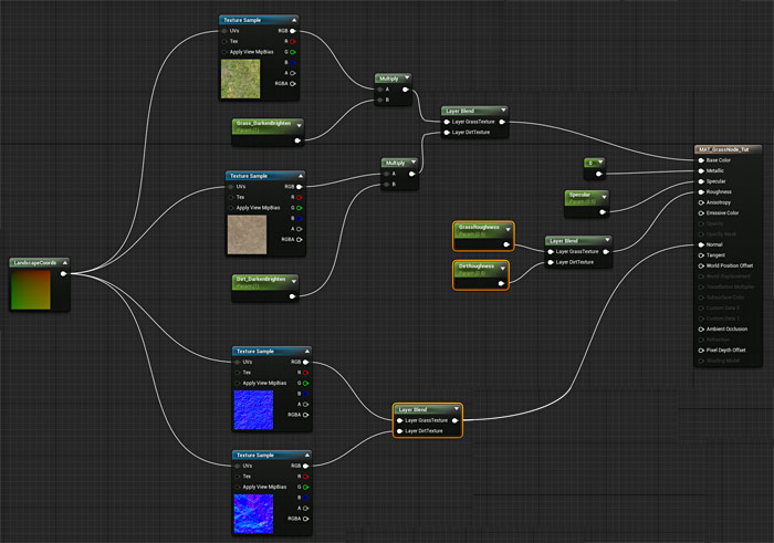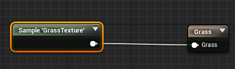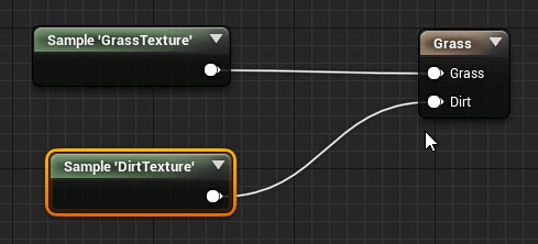 Insert another Landscape Layer Sample and name it the same way as the second terrain texture layer from Layer Blend node. In my case it's DirtTexture. Connect Layer Sample DirtTexture output into the second input of Grass Output node: