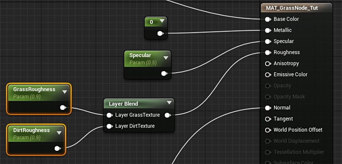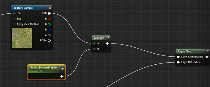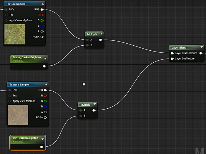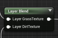 We have two texture layers GrassTexture and DirtTexture defined using the Layer Blend node:
