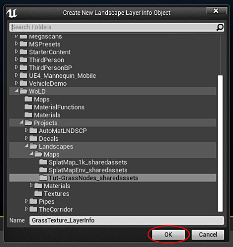 When the menu pops up for saving the Layer Info, click OK. UE4 will create a folder with the map name and save Layer Info's into this folder. I rarely change this folder location: