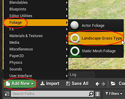 In Content Browser, Add New then Foliage and create Landscape Grass Type: