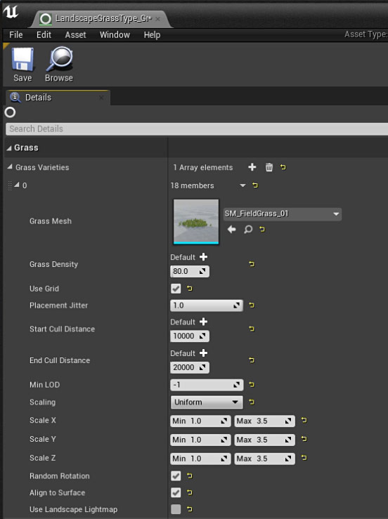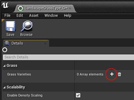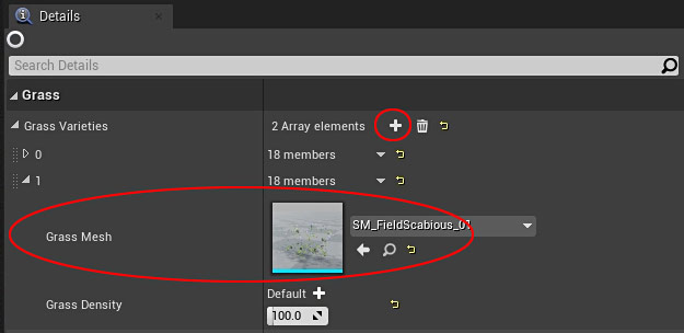 Now we need to assign which Static Meshes to spawn. Back in Content Browser, double click on the Landscape Grass Type to open its properties. Click on the Plus icon to create the first element: