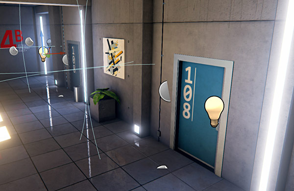 The rest of the lights are small fill-in lights. These lights are static with very small influence radius and intensity. Fill-in lights are positioned near elevator door, side hallways and upper floor: