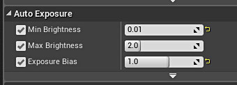 Post Process will allow me to change scene colors, bloom, depth of field and many other settings. Although focus of this will be in hour 8. Right now I need to update Auto-Exposure/Eye Adaptation Post Process settings to:
