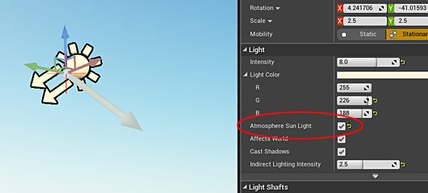 There is one setting I need to make sure to enable. Select Directional Light and in details panel turn on Atmosphere Sun property.