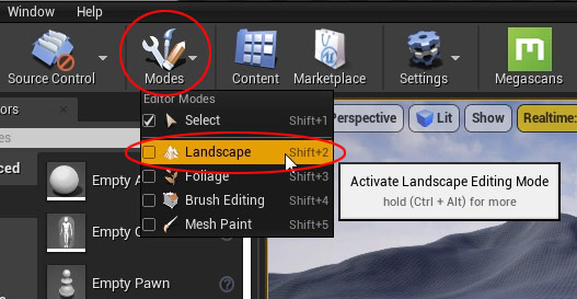 You will have the Landscape panel on the left hand side and the Manage, Sculpt and Paint tabs will appear within the perspective viewport: