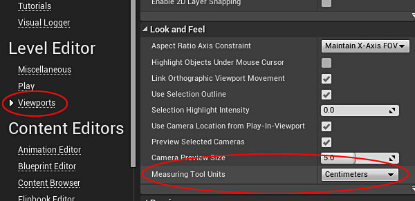 Under Level Editor: Viewports > Look and under Feel: Measuring Tool Units > Centimeters: