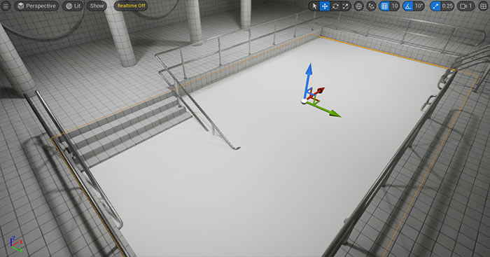 To begin, you'll need a simple environment to test the water material. For this tutorial, I'll be using a room from the Infinity Tiled Rooms and Pools modular asset pack, lit with rectangular and point lights - no directional or exterior lights. This setup avoids issues with the Single Layer Water shader, which I'll discuss later.