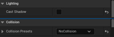 Disable Collisions and Shadows: Select the plane, go to the Details panel, and set Collision Preset to No Collision so characters can pass through. Disable Cast Shadow to prevent unwanted shadows.