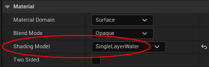 Configure the Shading Model: Open the material and select the main node. In the Details panel, change the Shading Model from Default Lit to Single Layer Water.