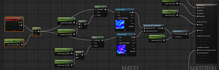 With a few tweaks, this material can be adapted for more dynamic water surfaces like seas or oceans. This same material was used in an environment featuring Infinity Tiled Rooms and Pools.