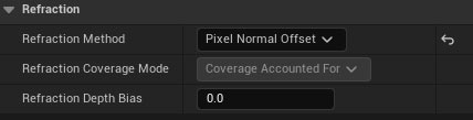 Configure Refraction Method: Select the main node, go to the Details panel, and set Refraction Method to Pixel Normal Offset (preferred for large water planes over Index of Refraction).