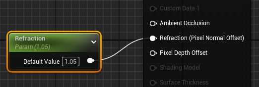 Add Refraction Parameter: Add a ScalarParameter named Refraction with a default value of 1.05. Connect it to the Refraction input of the main node.