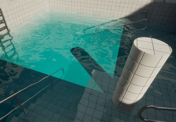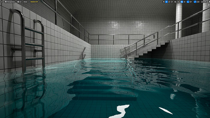 The HDRI-lit scene eliminates harsh shadows on the water plane, provides realistic reflections and maintains a natural look. This solution doesn't require Ray Tracing to be used.