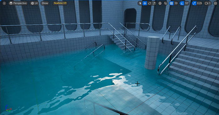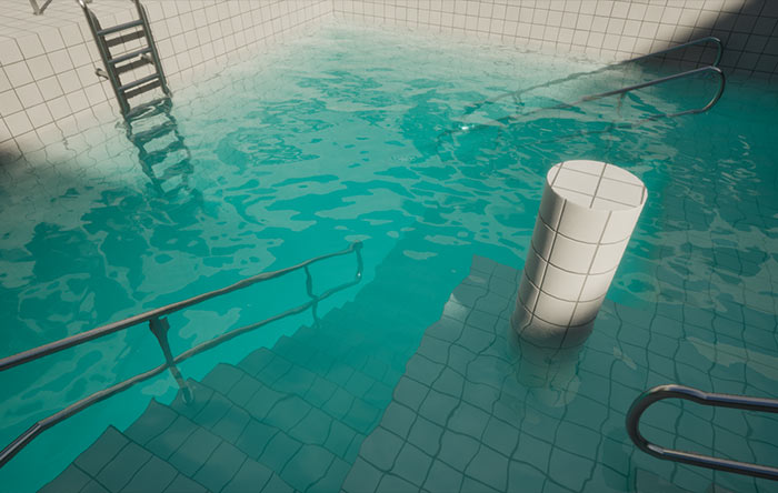Limitations: This solution only works for shallow water, where the bottom surface (e.g., landscape or static mesh) is visible.