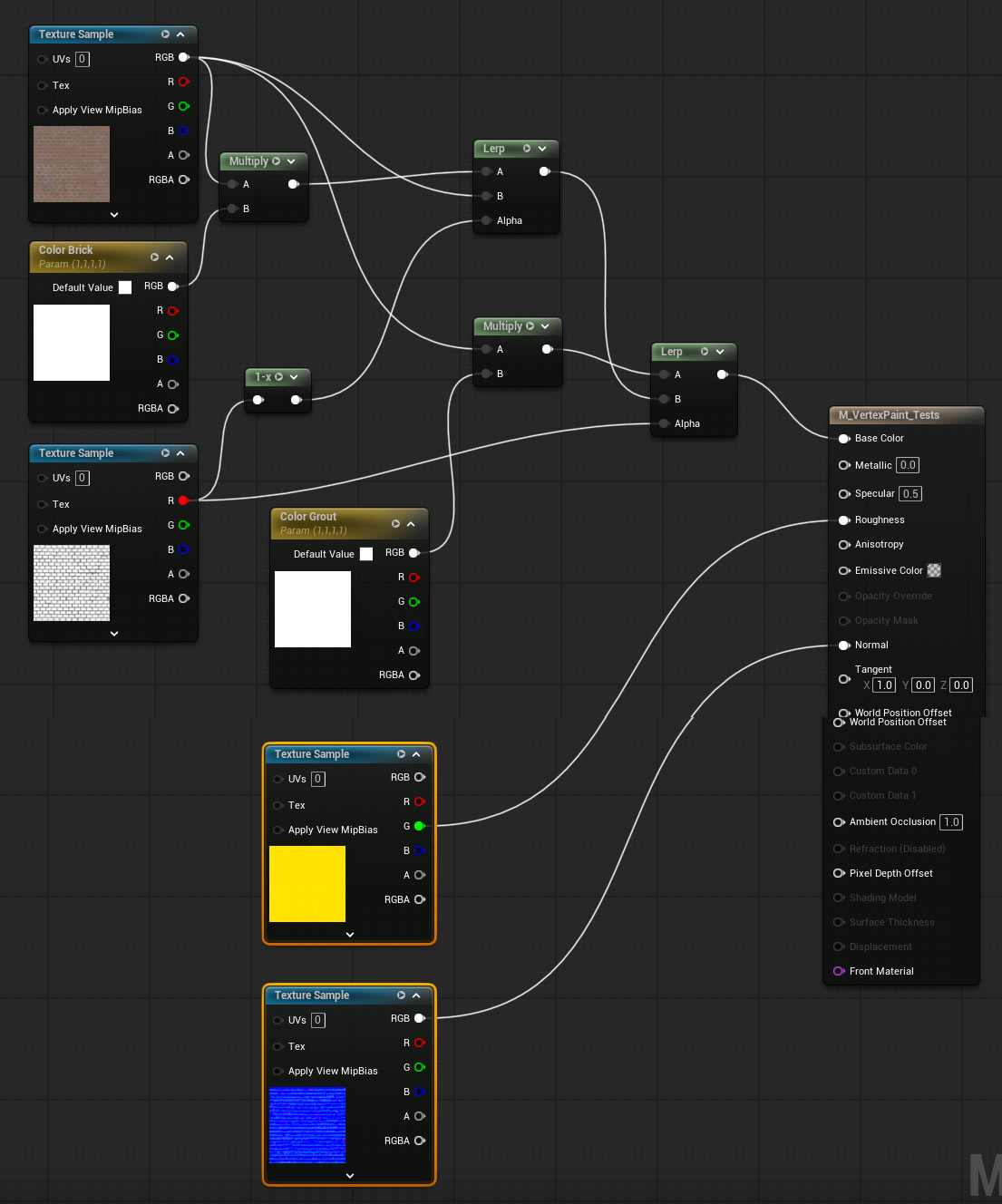This method relies on texture masks, Multiply nodes and Linear Interpolate (Lerp) nodes.