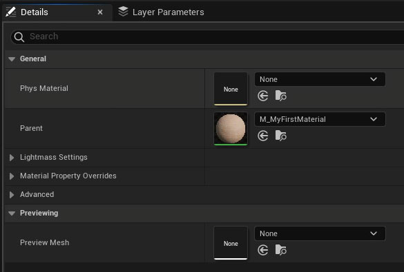 Open the Material Instance by double-clicking on it, this opens up Material Instance Editor. Initially, no editable properties will appear because no parameters are defined in the Material.