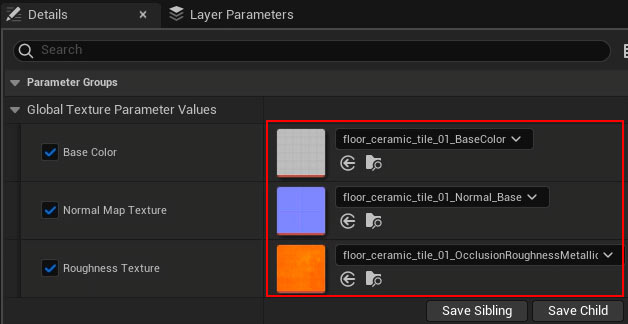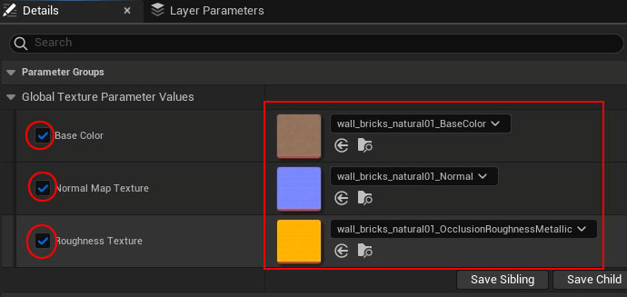 Enable each parameter by checking the box next to it, allowing you to swap textures without altering the main Material: