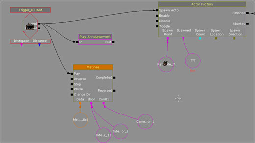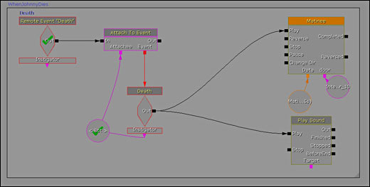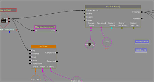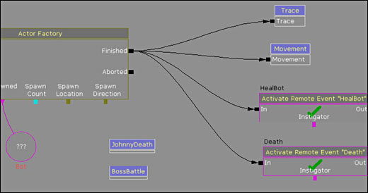 2. Next, we can set up a scenario where we detect the Bots Death and then fire off an action from it. To do this, create a Remote Event (R + LMB) and name it Death, or something similar. Hook the action Death up to the finished of the Actor Factory and move the action part of Death to somewhere away from the other kismet setups. From the Event of Death create a new Attach to Event action found under New Action - Event - Attach to Event.