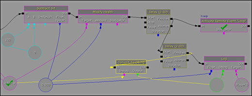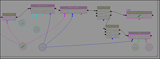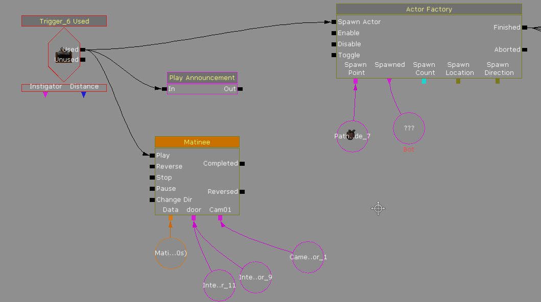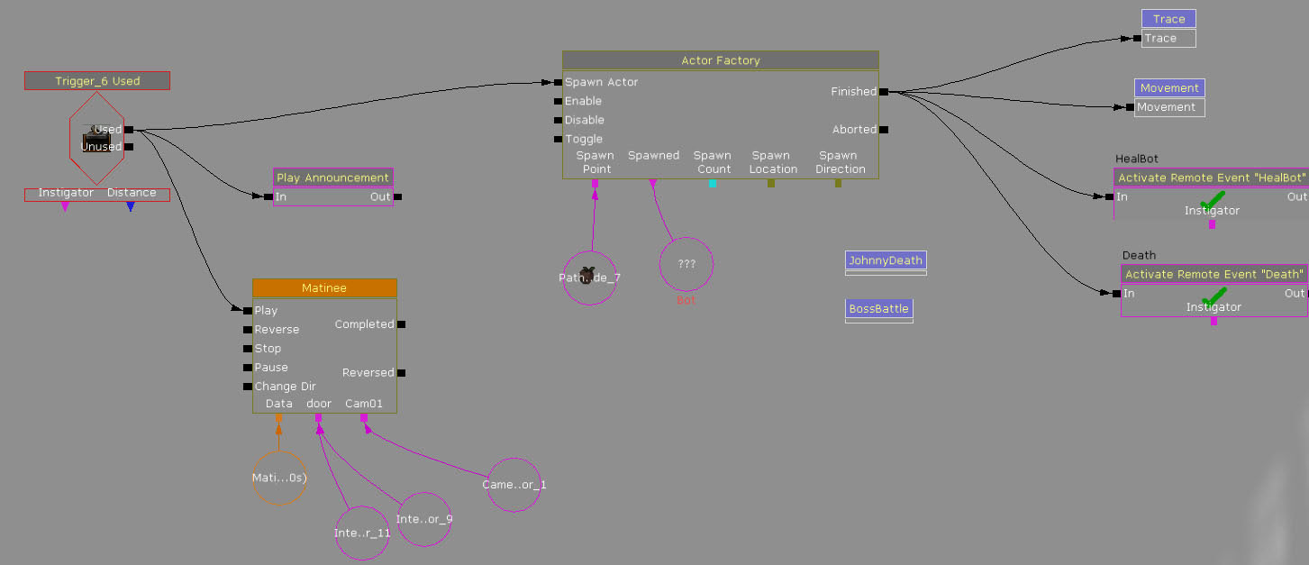 The Matinee hooked up to Death in the image above opens a door to the next part of the level and also plays a Death sound found under: SoundCue 'A_Music_GoDown. MusicStingers. A_Stinger_GoDown_Playerdeath01Cue' Anything you want to happen when the Bot dies can be fired off from this event. For example, you may wish to take away all the weapons from the player, or even replenish their health if they lost any in the battle.
