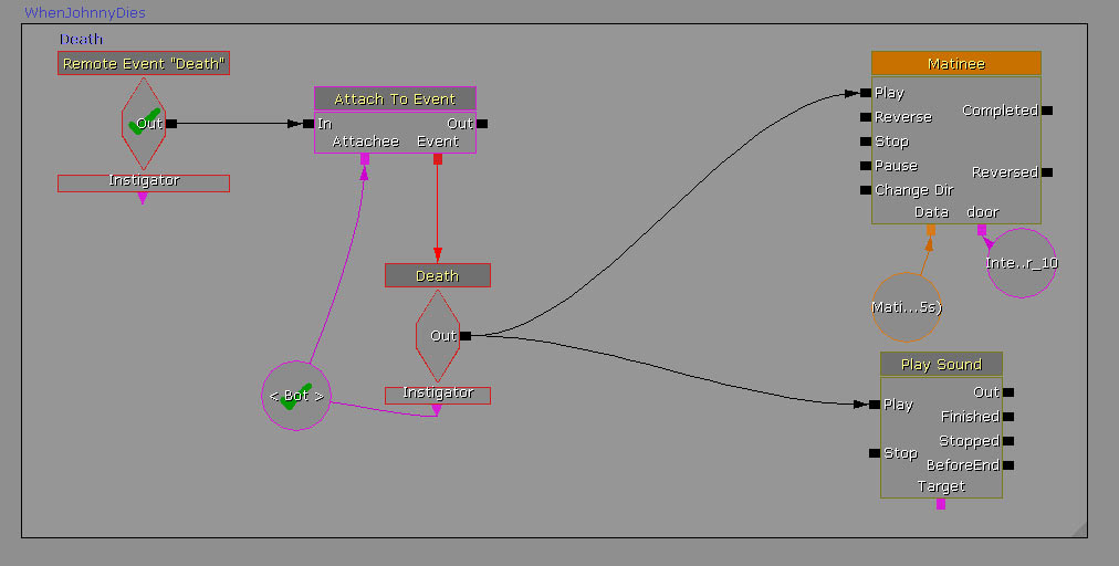 Create a Death event also found under New Event - Pawn - Death. Hook the Out of the Death remote event to the In of the Attach to Event. The Event variable box should be dragged into the top of the Death event to connect them. To link them, create a new Named Variable (N + LMB) and name it Bot. The Attachee of the Attach to Event and the Instigator of Death should both be linked to this.