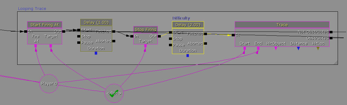 3. Next, we need to change the difficulty of the bot as it was very challenging to kill him in-game. To do this, we can locate the Delay in the second looping trace sequence after the Stop Firing action. This Delay controls how long the Bot stops firing for. I have changed mine from 0.25 to 2 seconds. This gives the player time to regain control of the match and kill the Bot. You can play around with this value to get the setup you like. The higher the number, the easier the Bot will be to kill.