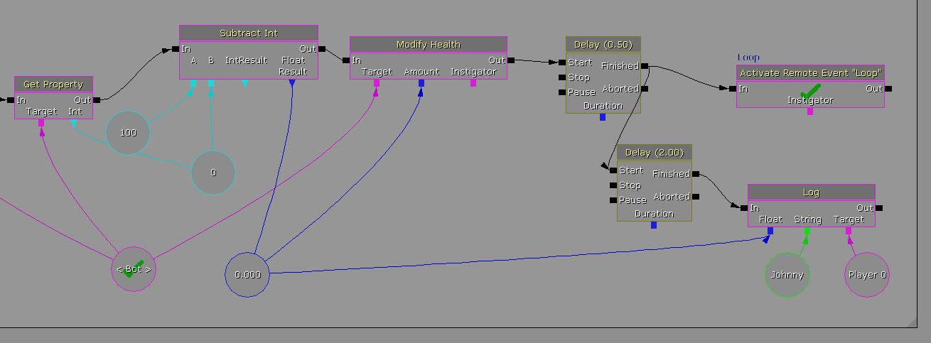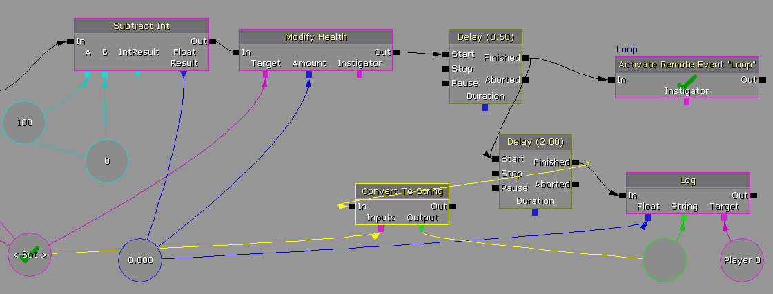 4. We also have a log that logs the Bots health to the screen in the Boss Battle sequence. This logs the Bots health to the screen every 0.5 seconds which is a few too many times for the players need. To solve this we'll add a Delay action into the sequence. If you put your mouse over the top of the In input of the Log and hold D + LMB it will create a Delay action in the sequence (see image below). Give the Delay a value of 2 seconds. This will only output the Bot's health every 2 seconds when the Log is called (theoretically, because you have a 0.5 second delay in there it will make 2.5 seconds).