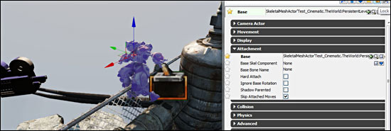 To get a camera to follow the skeletal mesh we can attach it to the actor in the editor instead of using Kismet. Select the camera and lock its properties by pressing the padlock at the top of the properties box Lock Selected Actors. Now you can select other actors without the properties changing. Select the skeletal mesh LIAM and input him in to the Attachment Base field.