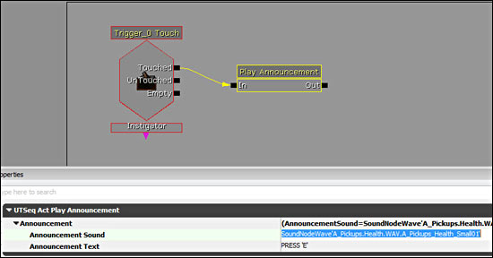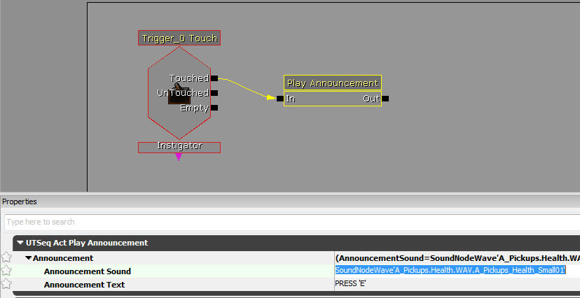We can start by deciding how we want to trigger the cinematic to start. Select your trigger in the level and right click in Kismet and choose a new Touch event. We also want to add a Play Announcement action. In the Play Announcement action change Announcement text to Press 'E' and you can also add a Announcement sound if you wish. For this example I used SoundNodeWave 'A_Pickups.Health. WAV.A_Pickups_Health_Small01'.