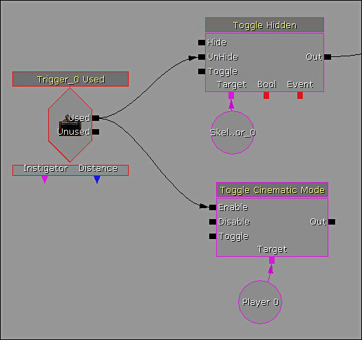 Next we need a Used trigger so that when the player does press E we can start the sequence. Make sure you turn off Aim to Interact and you can change the trigger distance if you wish also. We also need to add a Toggle Hidden action found in New Action - Toggle - Toggle Hidden. Hook the Used up to Unhide. The target will be the Skeletal mesh that you have hidden in your scene. In this case it is the robot LIAM. We also need to Toggle the Cinematic mode so that the player can't move around during the sequence. Right click New Action - Toggle - Toggle Cinematic mode. The target will be the player and make sure you hook up Used to Enable.