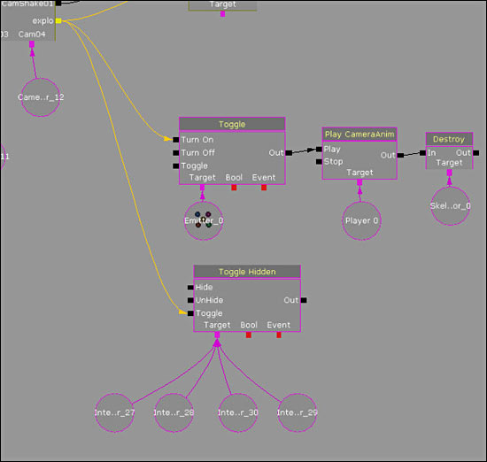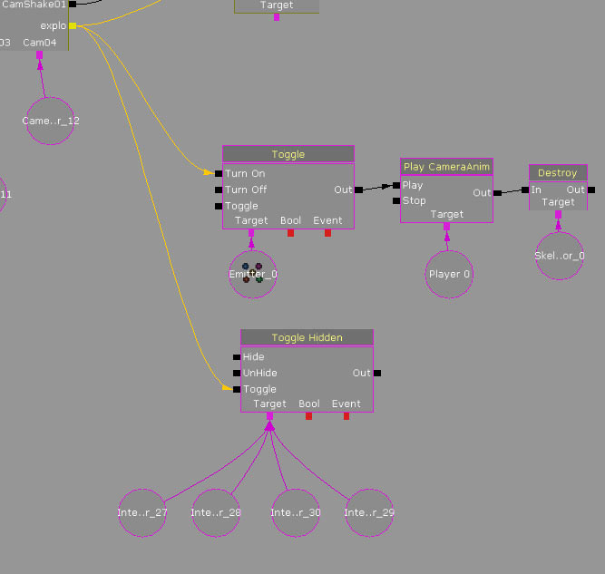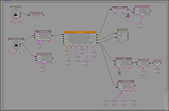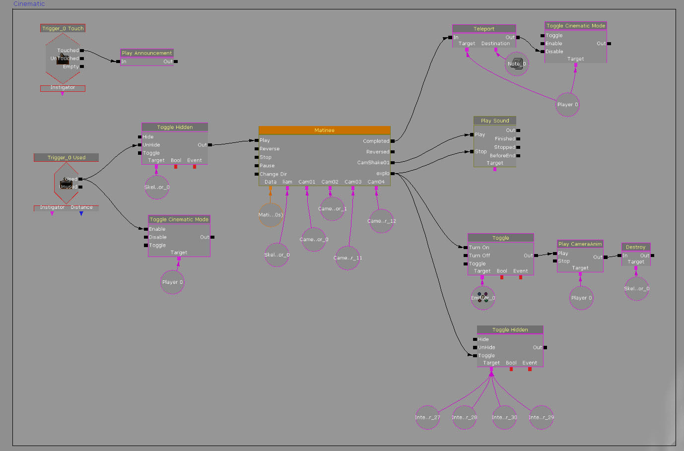 Here is an image of the sequence as a whole. The best way to create these Cinematic events though is to play around yourself and think of some cool ideas and try to create them using the Animations, Emitters, Cameras, Sounds and Matinee tracks. Play around with the different settings and variations to add depth to your cinematics.