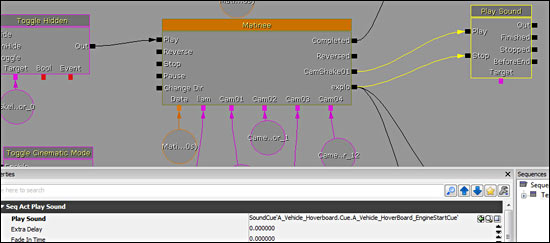 At the start of the sequence I also wanted to play a sound of LIAM grinding down the rail. In this example I used SoundCue 'A_Vehicle_Hoverboard. Cue.A_Vehicle_ HoverBoard_ EngineStartCue' and added a Play Sound action (S+LMB). The Play goes from the CamShake event output which I added at the very start of the Matinee event track. And the Stop is when the explo triggers because this is when LIAM is no longer grinding down the rail.
