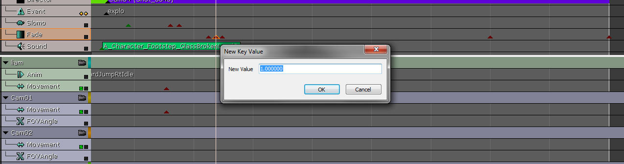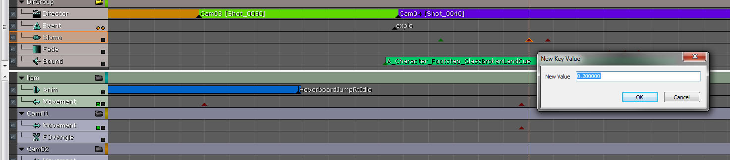 2. Now that we have the character smashing through the glass I want to add slow motion so that it looks like he is flying through the air and then smashing in to the wall. To add a Slowmo track right click on the Director Group and Add New Slowmo track. By default, a value of 1 is normal speed and the closer to 0 you go the slower the speed. I have two keys at the start of my track both with values of 1 for the slow motion. This is because if we started adding keys when the character when through the glass, the track would be slowing down continuously throughout the track, so we need to add 2 keys of 1 so that it stays at a constant rate. Then when you want the player to fly through the air slow the speed down to 0.2 by adding a key and setting the value. Then when you want the slow motion to end, add a key and set the value back to 1.