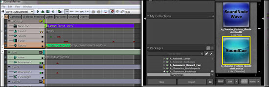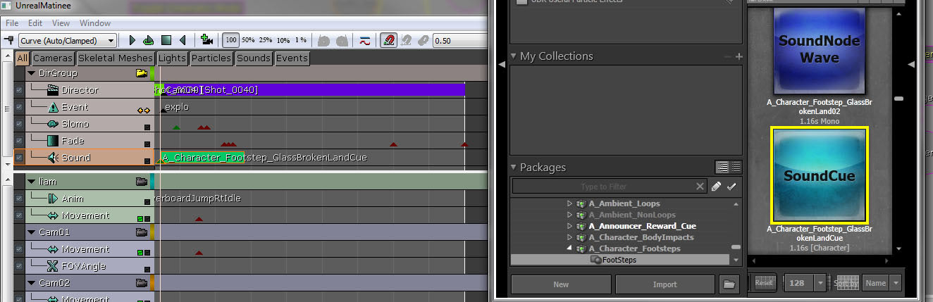 To add a sound track right click on your Director Group and select Add New Sound track. With a sound cue selected in your content browser, for this I used SoundCue 'A_Character_Footsteps. FootSteps. A_Character_Footstep_Glass BrokenLandCue', add a key (Enter or Add Key button) and the sound will appear on your track. That's really all there is to it. You can set the volume and pitch and have a play around with a few things, but you don't really need to change too much.