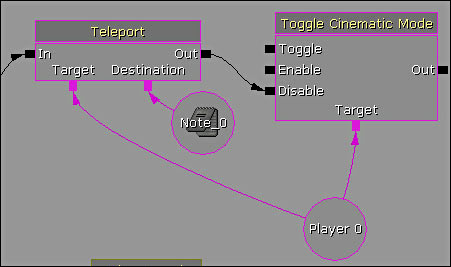 The target of both actions is the Player and the Location of the Teleport is the Note. With the Note selected in the viewport right click on the Teleport Location and select New Obj Var Using Note_0. This will teleport the player to the location of the note at the end of the sequence.