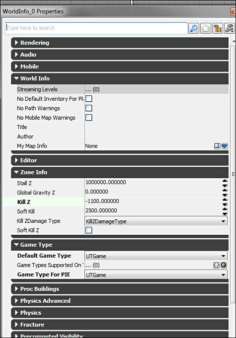 6. Lastly, if you are using a setup similar to mine where you go below the player starting level (sliding down the rail) then you will have to alter your KillZ otherwise your player will keep dying. To do this click on View - World Properties at the top of your editor. Go to Zone Info and change your KillZ to a value of -1100 or something similar. In your perspective viewports you should see a Red line in the editor moving lower down. Whenever your player hits this line, they will die, so just keep that in mind.